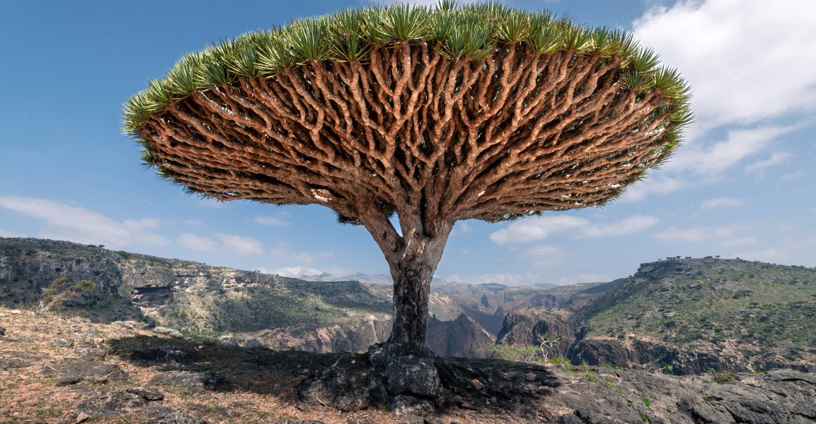 On a rugged plateau overlooking the Arabian Sea, a silhouette rises from the limestone that defies the laws of modern botany. It does not wave in the breeze like a willow, nor does it reach for the heavens like a redwood. Instead, the Dragon’s Blood Tree (Dracaena cinnabari) sits like a giant, inverted mushroom—or perhaps a green umbrella discarded by a passing titan.